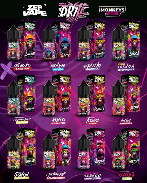 Жидкость Drill 30 мл 20 мг hard Вкусы: Грейпфрут-земляника Клубника-киви Яблочная жвачка Вишнёвая кола Манго-маракуйя Виноград-чёрная смородина Арбуз-лайм Киви-чёрная смородина Лесные ягоды Черника-малина Тропический ананас Банан-джекфрут