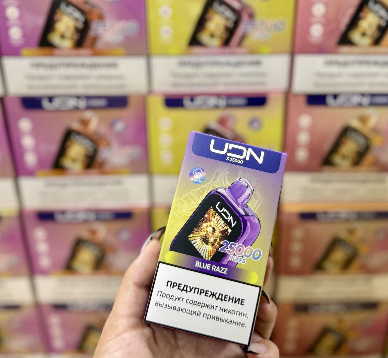 UDN S 25000 — одноразовый вейп с экраном и зарядкой, рассчитанный на длительное использование. Яркие вкусы, мощность и удобство в одном устройстве.
